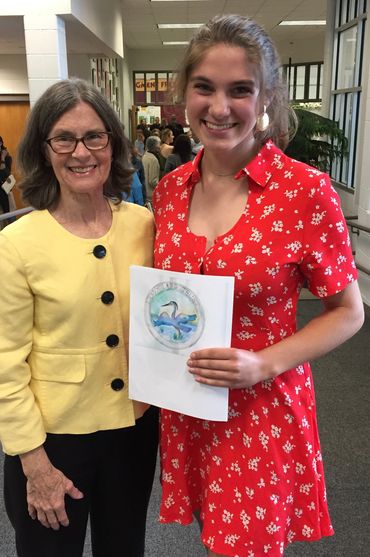 ABOVE - Reilly Burke accepts Lenox Land Trust Logo Contest award from Kate McNulty-Vaughan at 2018 Seniors Night. Also, Kim Blair wins book award drawing at 2019 LLT Annual Meeting & Community Conversation.